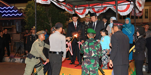 Lampung Selatan, www.lensamedia.net– Ribuan orang mengikuti Pawai Obor dalam rangka Peringatan HUT RI Ke – 72 Tahun 2017 di Halaman Depan Kantor Pemkab Lampung Selatan, Rabu malam (16/08/17)