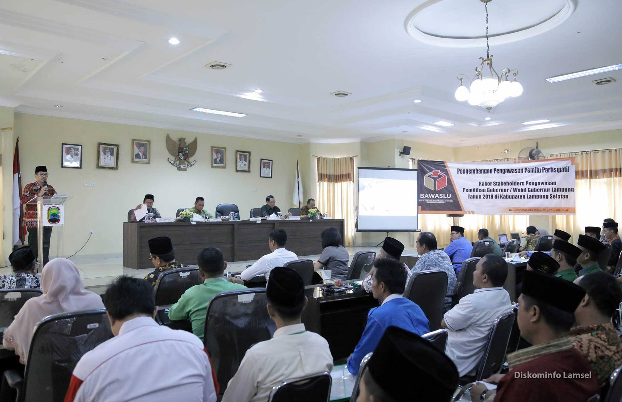 Lampung Selatan, www.lensamedia.net  – Badan Pengawas Pemilu (Bawaslu) Kabupaten Lampung Selatan menggelar Rapat Koordinasi (Rakor) Stakeholders Pengembangan Pengawasan Pemilu Partisipatif, di Aula Krakatau kantor bupati Lampung Selatan, Jumat (20/4).