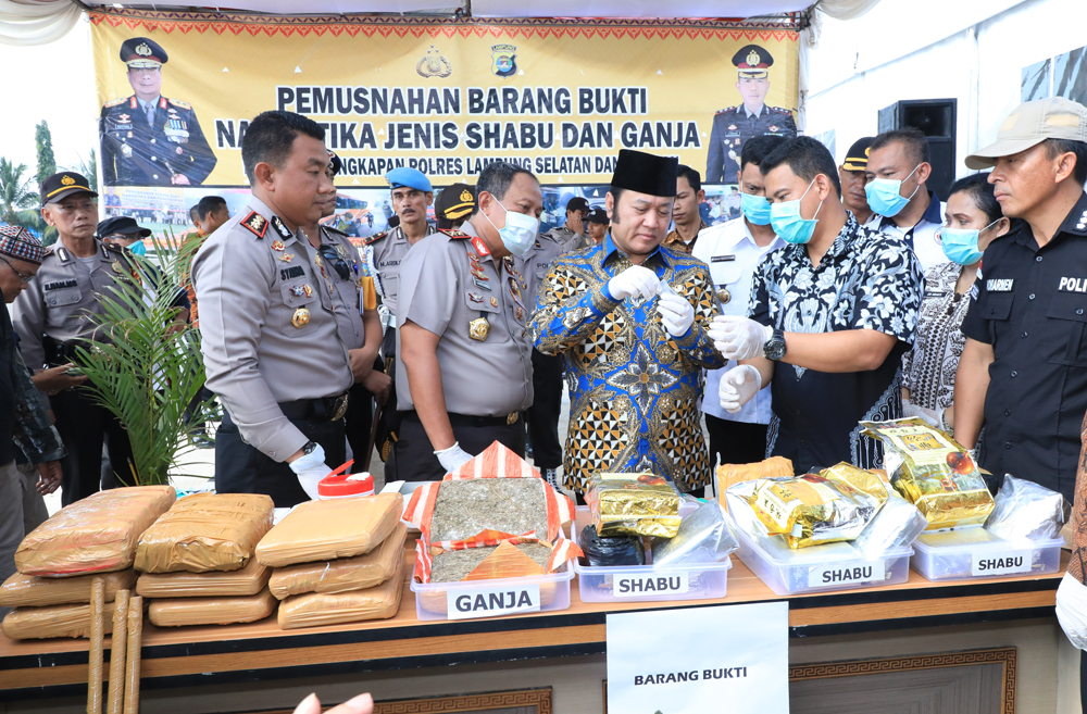 Pada acara itu, sekaligus dilakukan pemusnahan barang bukti narkoba hasil ungkap kasus jajaran Polres Lampung Selatan selama tahun 2018. Hadir Danlanal Lampung, Anggota Fokorpimda Lampung Selatan, serta pejabat teras Polda Lampung.
