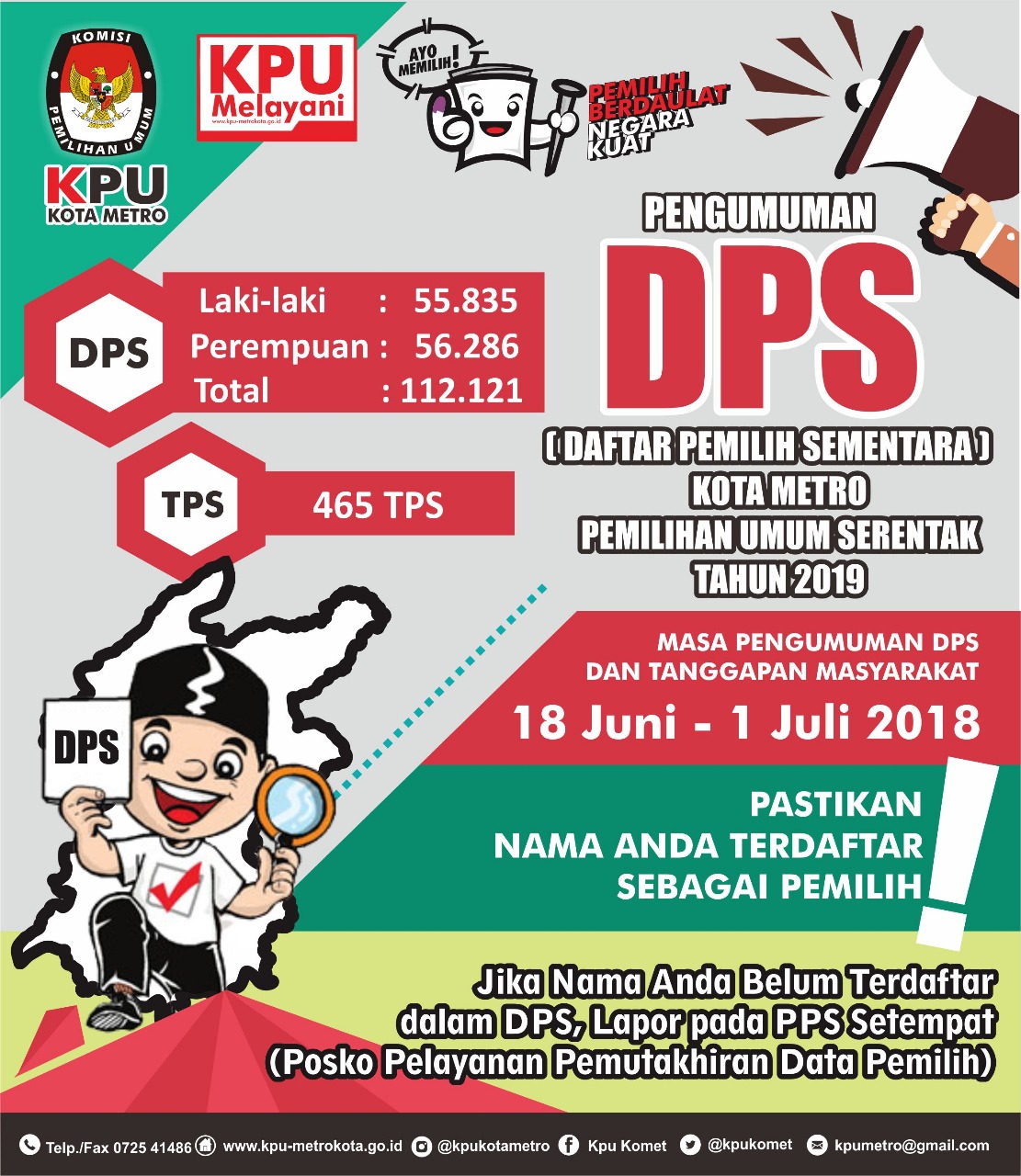 Penetapan tersebut dengan rincian jumlah DPS berjenis laki-laki berjumlah 55.835 orang dan 56.286 wanita serta jumlah TPS diseluruh Kota Metro berjumlah 465 TPS.