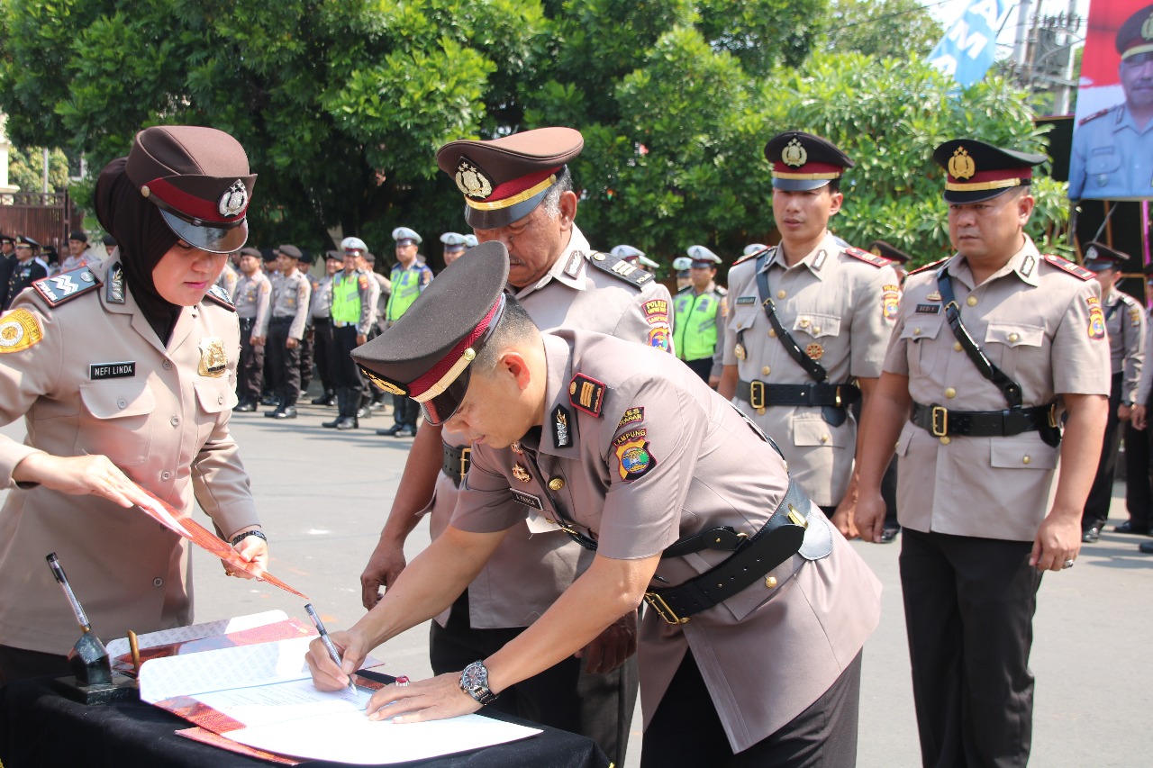Dalam hal ini Kapolres Metro AKBP Umi Fadilah Astutik yang memimpin langsung upacara Serah Terima Jabatan mengambil sumpah jabatan dari pejabat lama ke pejabat baru Polres Metro.