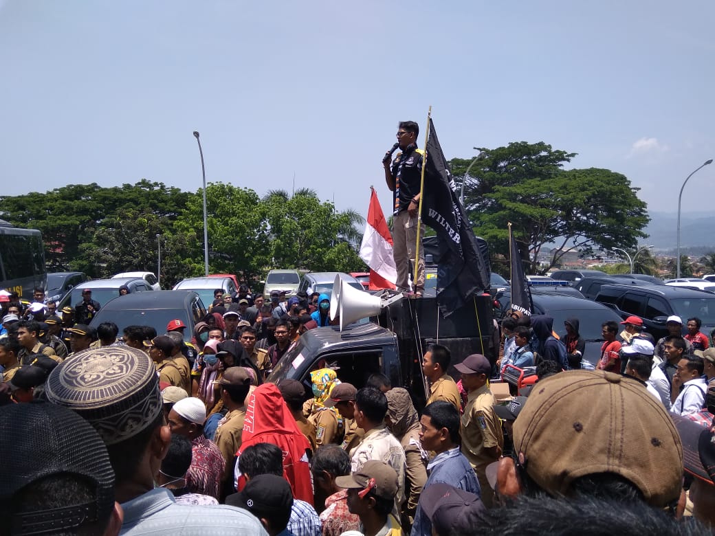 Bandarlampung,www.lensamedia.net –Sekitar 500 orang masa masyarakat Pekon Banjarejo kecamatan Banyumas ,Kabupaten Pringsewu dan Masyarakat Pamenang Kecamatan Pagelaran ,Kabupaten Pringsewu bersama Gerakan Masyarakat Bawah Indonesia(GMBI) berunjuk rasa di depan Polda Lampung menuntut agar Kepala Pekon(kakon)Banjarejo Herman dan Sungeb selaku warganya yang di tangkap tertanggal 20 September 2018 segera dibebaskan Senin(24/9)