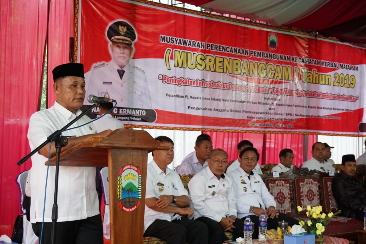 Kepastian itu disampaikan Kepala Badan Perencanaan Pembangunan Daerah (Bappeda) Lampung Selatan Wahidin Amin, saat memaparkan rencana kegiatan Kecamatan Merbau Mataram tahun 2019 dalam acara Musrenbang Kecamatan Merbau Mataram di Lapangan Desa Sinar Karya, Rabu (6/3/2019).