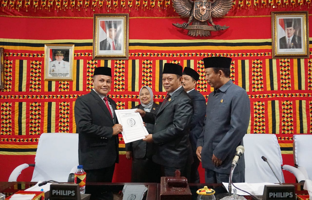 Sidang yang dipimpin langsung Ketua DPRD Hendry Rosyadi, SH, MH, berlangsung di ruang sidang utama DPRD setempat, Senin (22/4/2019). Hadir dalam paripurna tersebut, Pelaksana tugas (Plt) Bupati Lampung Selatan Nanang Ermanto dan anggota Forkopimda Lampung Selatan.