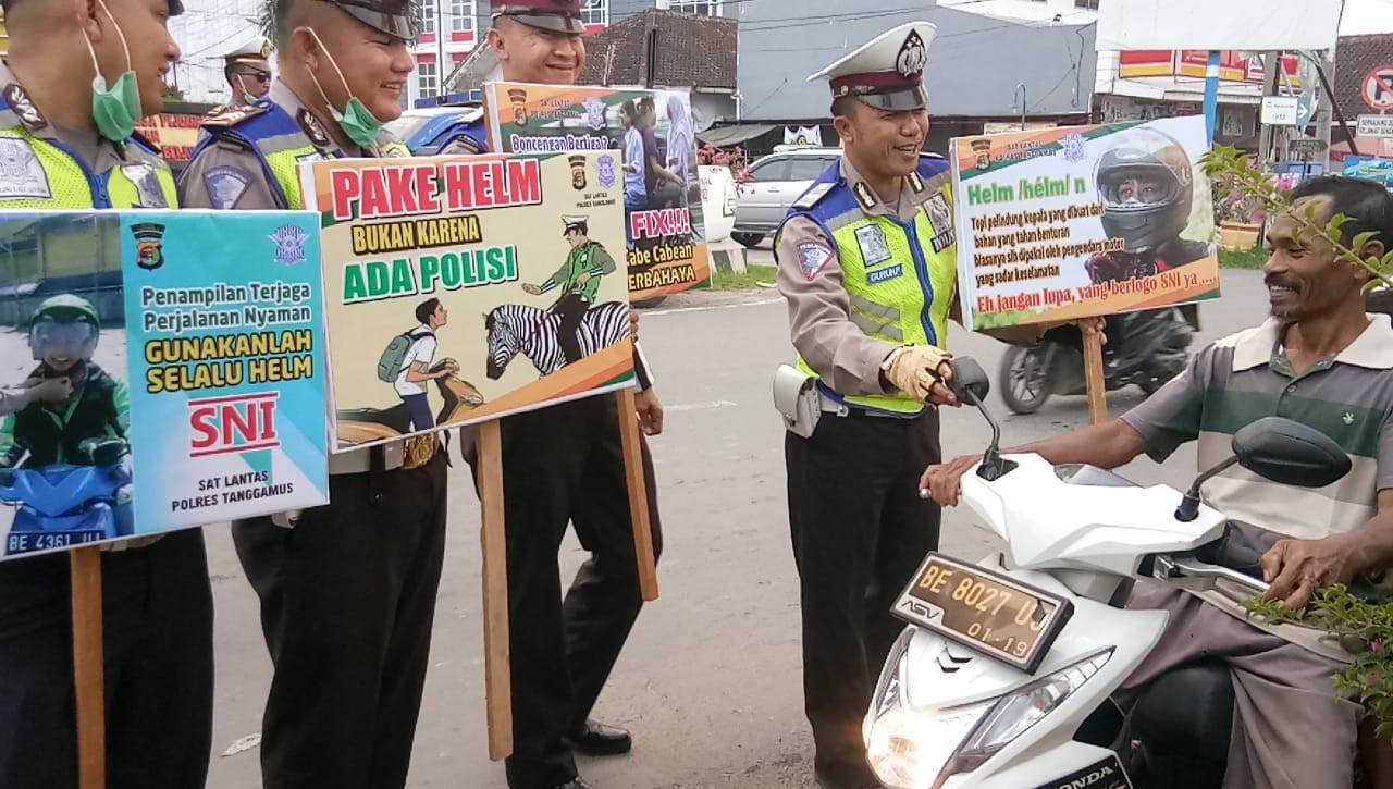 Petugas juga melaksanakan giat penerangan Dikmas Lantas, membagikan leafleat / stiker himbau lantas bahkan membagikan helm SNI kepada pengguna jalan yang tertangkap tangan tidak menggunakan helm saat berkendara.