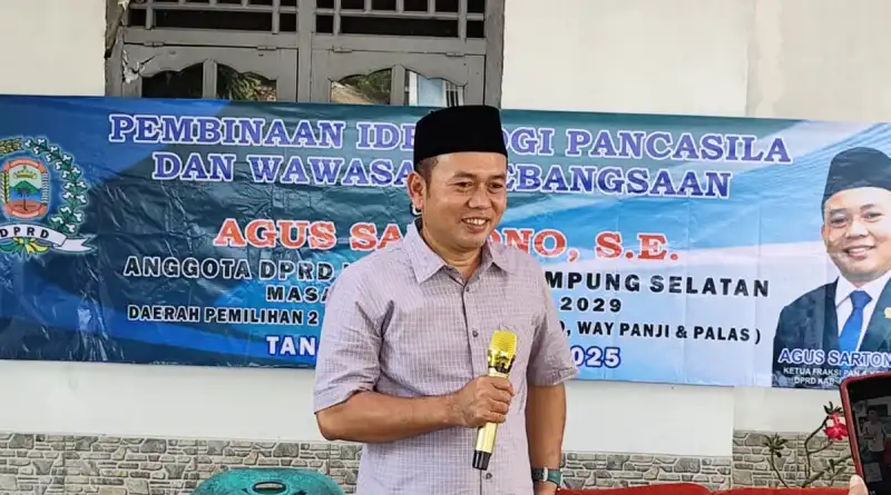 lampungselatan,www.lensamedia.net   Anggota DPRD Lampung Selatan Agus Sartono Gelar Ideologi Pancasila dan Wawasan Kebangsaan (IPWK) di Desa Suka Banjar Kecamatan Sidomulyo, jum’at (14/3/2025).