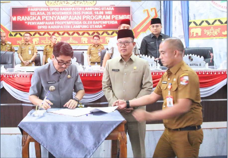 Kotabumi – Bupati Lampung Utara Dr. Ir. Hamartoni Ahadis, M.Si menghadiri Rapat Paripurna DPRD dalam rangka pengesahan Program Pembentukan Peraturan Daerah (PROPEMPERDA) Tahun Anggaran 2026 yang dilanjutkan dengan pengesahan Rancangan Nota Keuangan dan Raperda tentang Anggaran Pendapatan dan Belanja Daerah (APBD) Tahun Anggaran 2026. yang berlangsung pada 25 November 2025 di Gedung DPRD setempat.