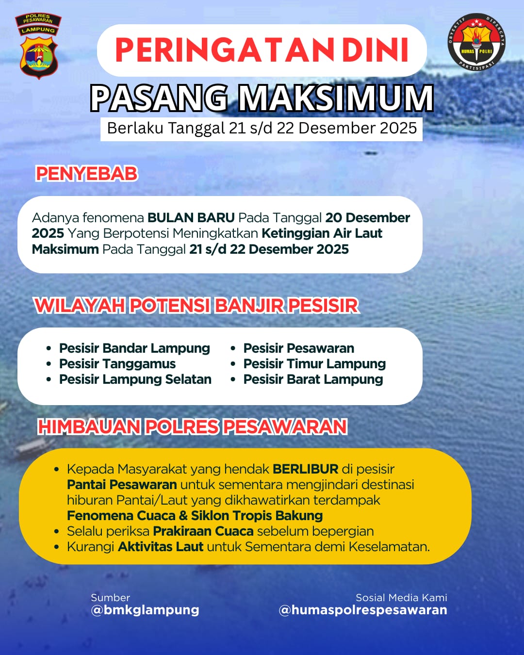Pesawaran, www.lensamedia.net – Kepolisian Resor Pesawaran merilis peringatan dini terkait potensi kenaikan air laut pasang maksimum yang diprediksi akan terjadi pada tanggal 21 sampai dengan 22 Desember 2025. Langkah antisipasi ini diambil untuk melindungi masyarakat dan wisatawan yang berada di wilayah pesisir Kabupaten Pesawaran.
