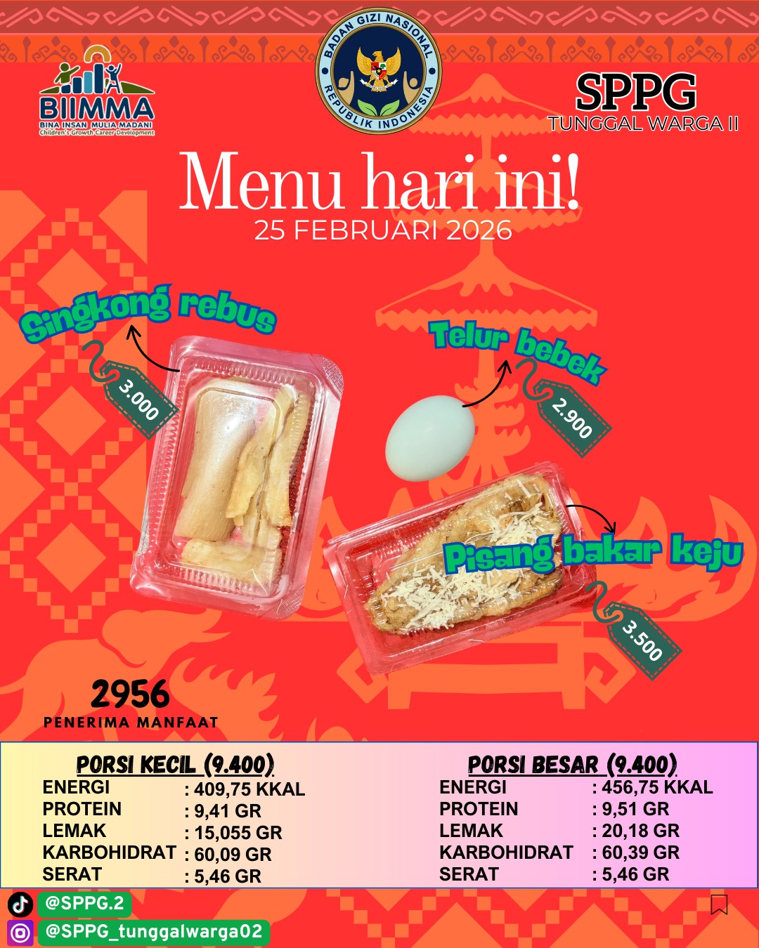 Rinciannya terdiri dari Singkong Rebus (Rp3.000), Telur Bebek (Rp2.900), dan Pisang Bakar Keju (Rp3.500). Total nilai gizi per porsinya diklaim berada di kisaran 409 hingga 456 kilokalori (Kkal).