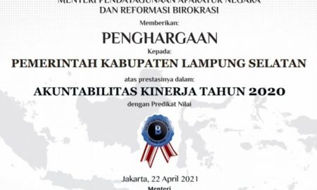 Lampung Selatan, www.lensamedia.net Pemerintah Kabupaten (Pemkab) Lampung Selatan kembali meraih penghargaan Akuntabilitas Kinerja Instansi Pemerintah (AKIP) Tahun 2020 sesuai sasaran indikator kinerja...