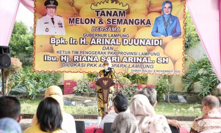 LAMPUNG SELATAN,www.lensamedia.net Gubernur Lampung Arinal Djunaidi bersama Ketua Tim Penggerak PKK Provinsi Lampung Ibu Riana Sari Arinal melakukan tanam perdana melon dan...