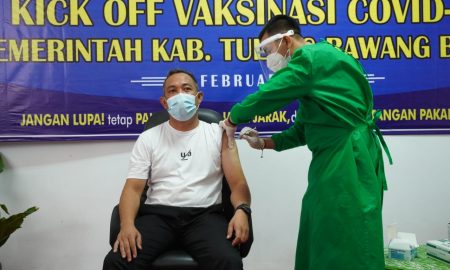 Tubaba,www.Lensamedia.net-Bupati Tulang Bawang Barat Umar Ahmad SP menerima vaksin covid 19 pada kick off vaksinasi covid 19 di RSUD Tubaba. Selasa (02/02)....
