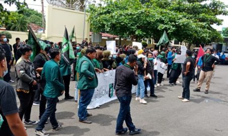 Metro,www.lensamedia.net Himpunan Mahasiswa Islam atau HMI se-Kota Metro melakukan demo atas penolakan Omnibus Law di depan Gedung DPRD Kota Metro, Senin (12/10/2020)....