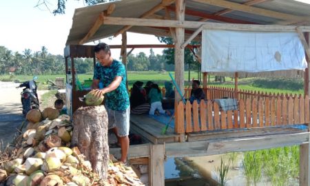 Lampung selatan. www lensamedia.Net--Ahil (29), penjual es kelapa muda, sibuk mengupas kelapa muda dagangannya di perkebunan sawah dusun sumber jaya Desa karang...