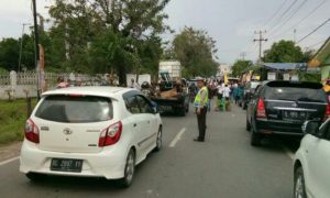 Kapolsek Katibung dan Anggota Kapos Pam Kawal Arus Mudik di Perbatasan Lam- Sel dan Bandar Lampung